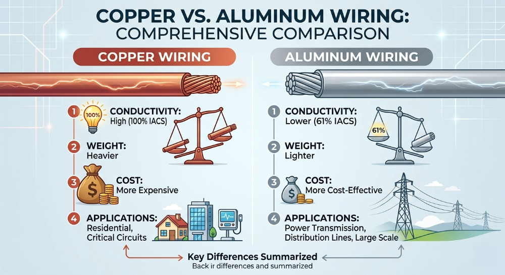 يعتمد قرار الأسلاك النحاسية مقابل أسلاك الألمنيوم على أهداف مشروعك. اختر النحاس عندما يكون الأداء والحجم الصغير والموثوقية طويلة المدى هي الأكثر أهمية. اختر الألومنيوم عندما يكون الوزن الأقل وتكلفة المواد المنخفضة هي الأولوية، وتأكد من أن التثبيت يستخدم الموصلات الصحيحة والأجهزة المتوافقة مع التعليمات البرمجية.