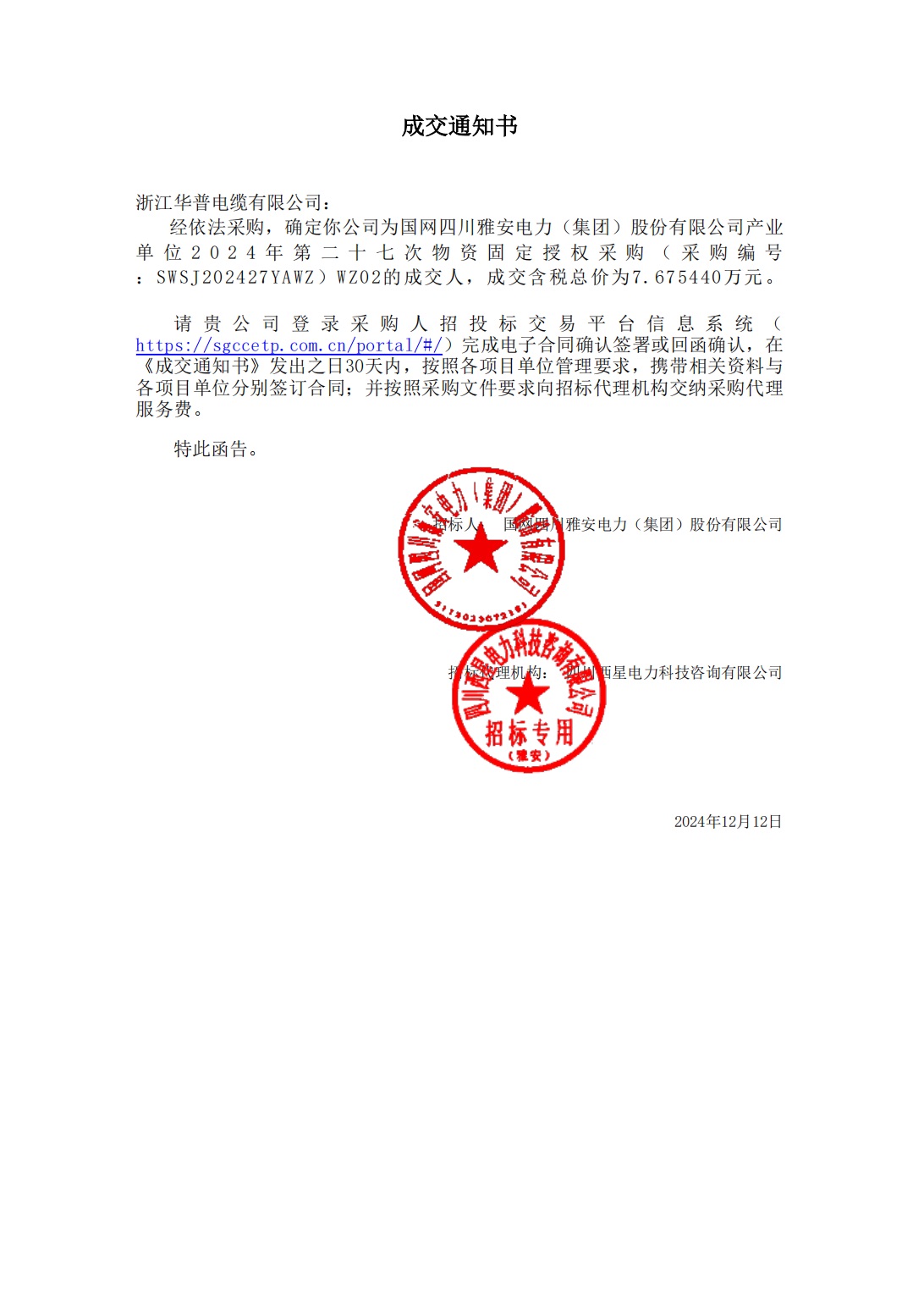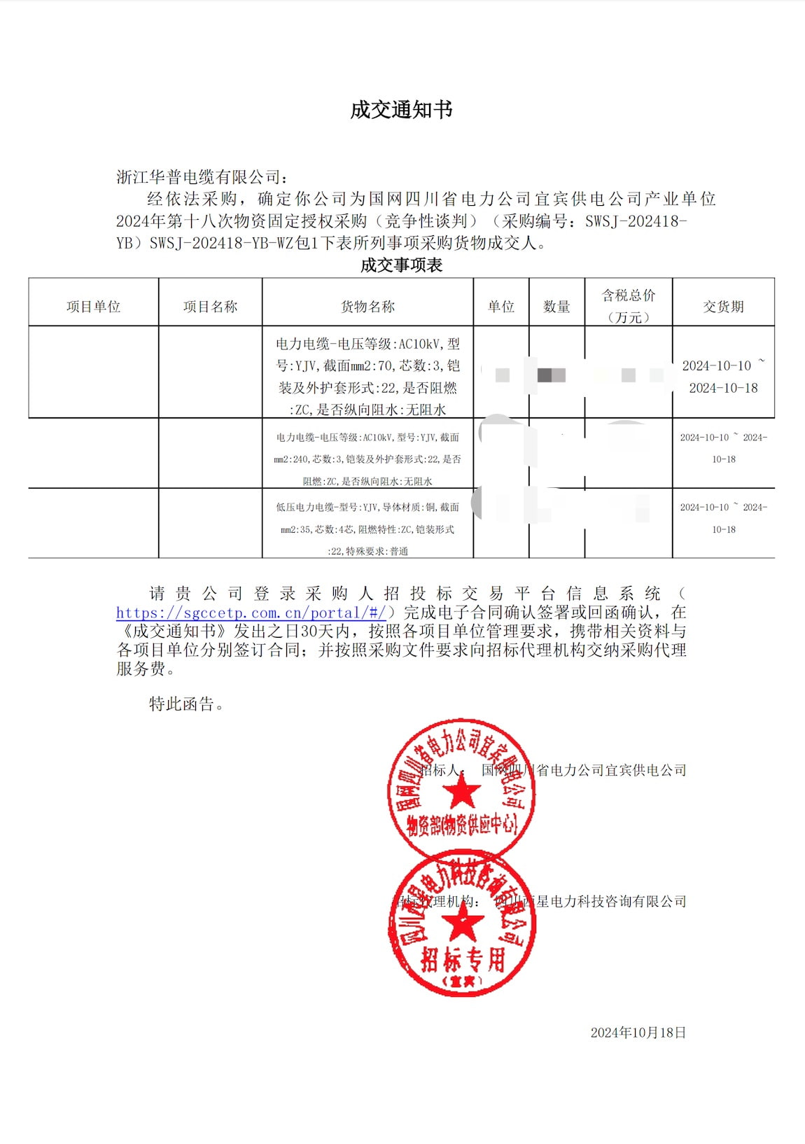 (إخطار الجائزة) شركة شبكة الكهرباء الحكومية سيتشوان ياآن للطاقة الكهربائية (مجموعة) المحدودة عملية الشراء الثابتة السابعة والعشرون للمواد المعتمدة للوحدة الصناعية في عام 2024