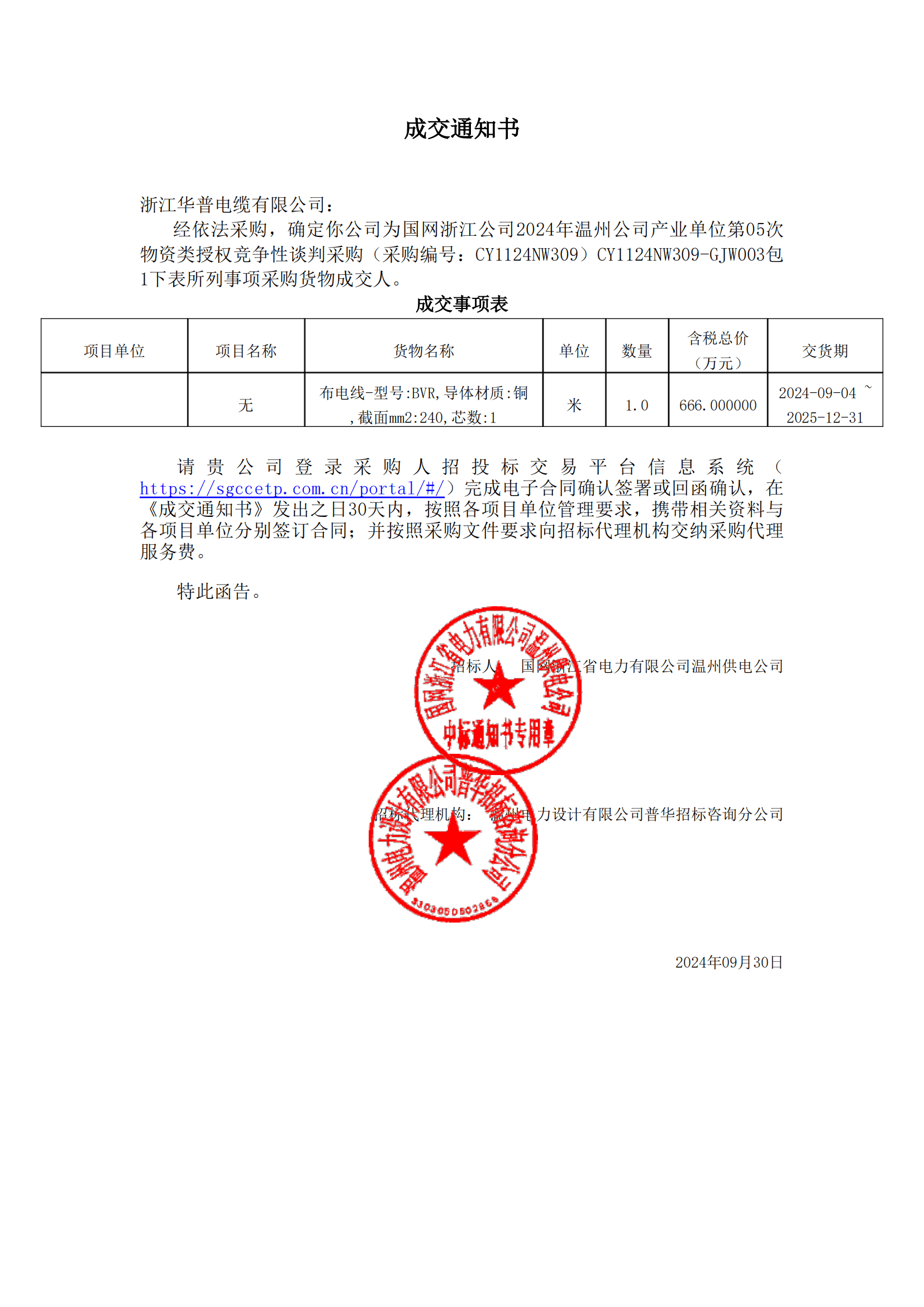 (إشعار الفوز بالعطاء) التفاوض التنافسي الخامس لشركة State Grid Zhejiang بشأن شراء ترخيص المواد للوحدات الصناعية التابعة لشركة Wenzhou في عام 2024