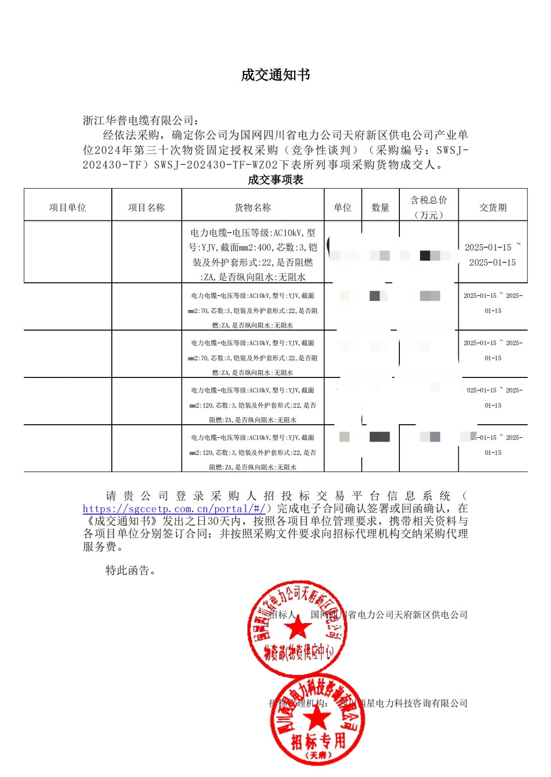 (إشعار الفوز بالعطاء) شركة الطاقة الكهربائية الحكومية في سيتشوان، شركة إمدادات الطاقة في منطقة تيانفو الجديدة، عملية الشراء الثابتة الثلاثين المعتمدة للمواد للوحدة الصناعية في عام 2024 (المفاوضات التنافسية)