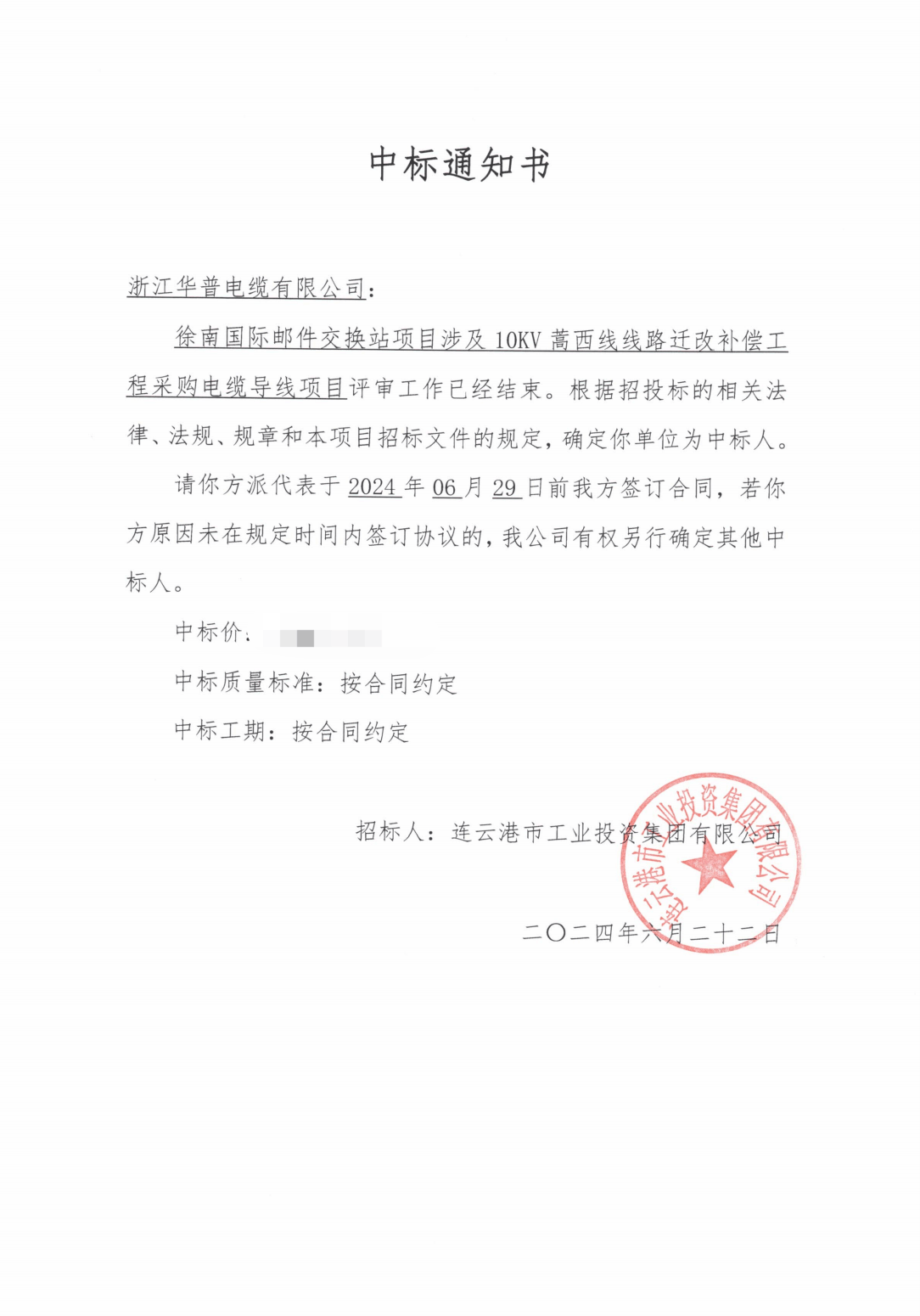 (إشعار الفوز بالعطاء) يتضمن مشروع محطة تبادل البريد الدولية في شونان شراء الكابلات والأسلاك لمشروع نقل وتعويض خط هاوكسي 10 كيلو فولت