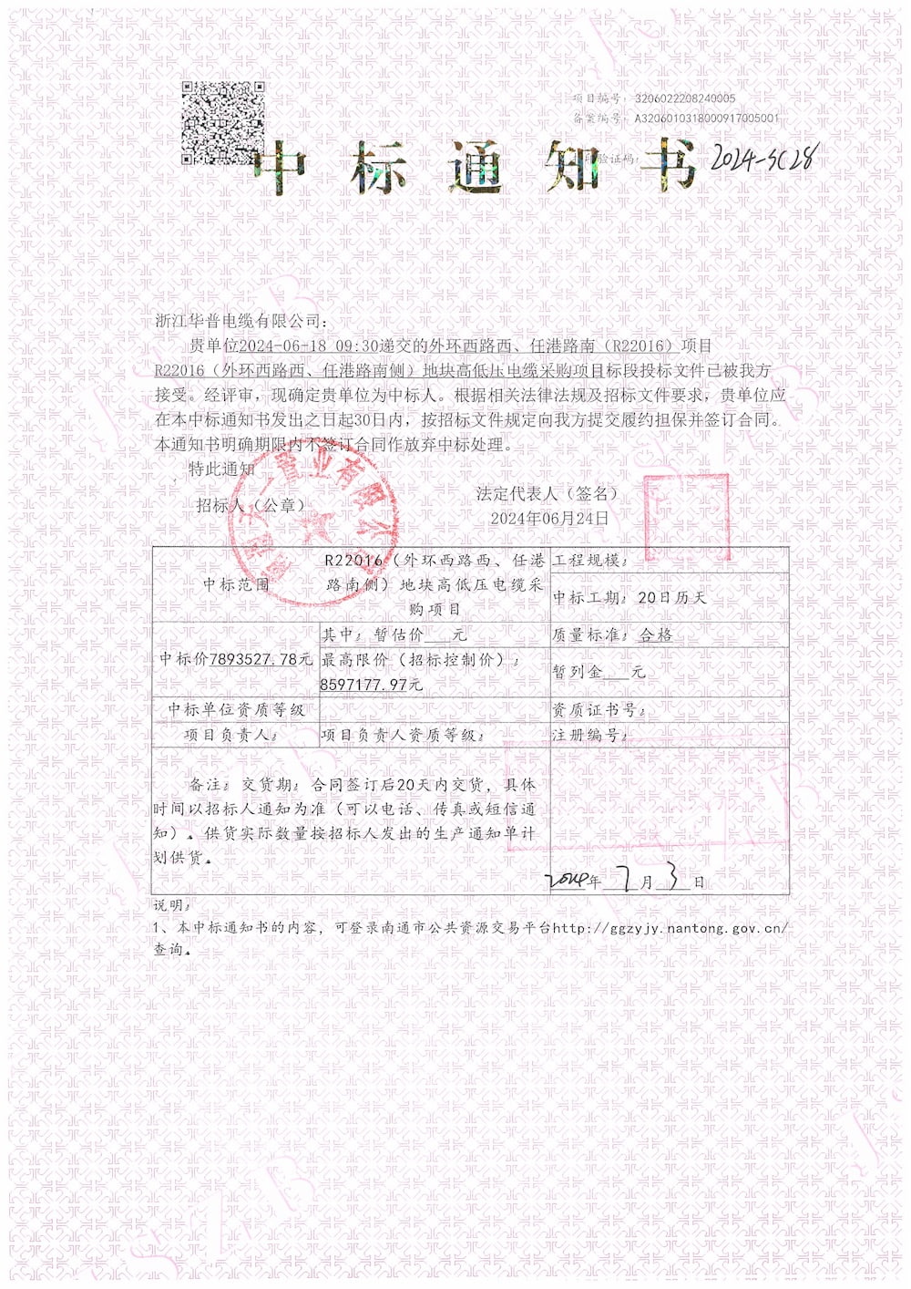 (إشعار الفوز بالعطاء) مشروع شراء كابلات الجهد العالي والمنخفض في نانتونغ R22016 (الطريق الدائري الخارجي الغربي، طريق رينجانج الجنوبي)