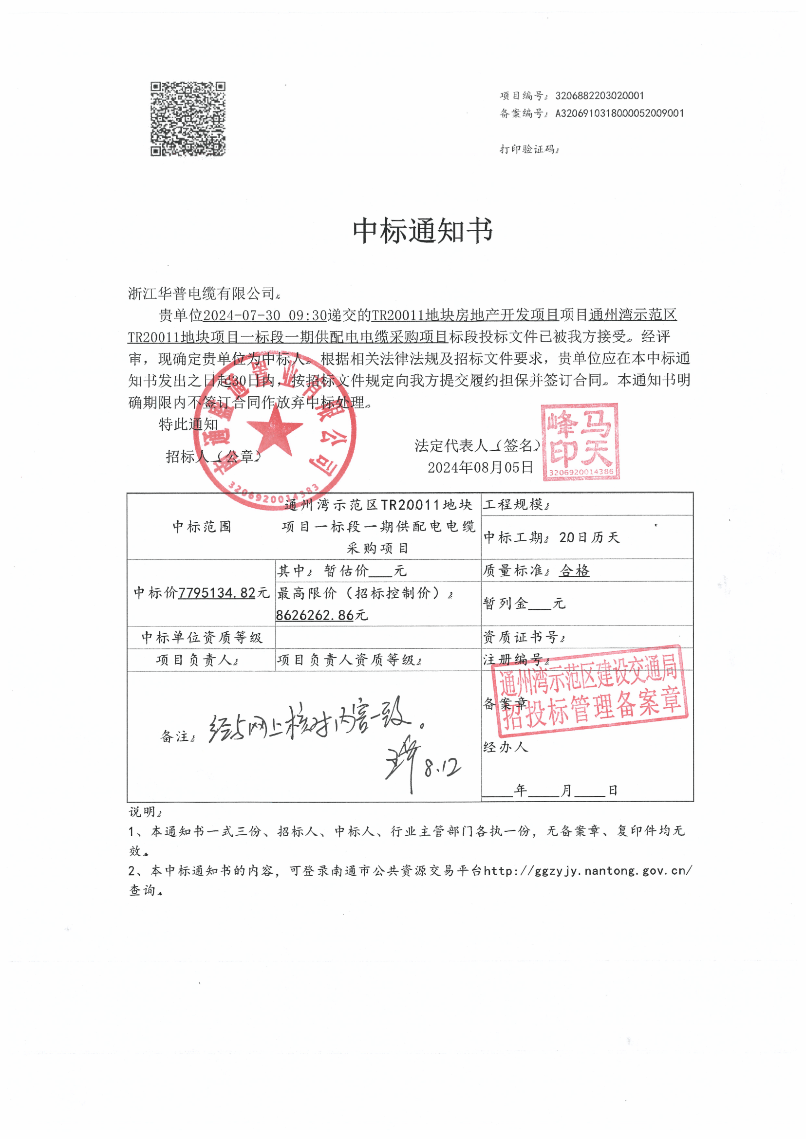 (إشعار الفوز بالعطاء) شراء كابلات إمداد وتوزيع الطاقة للمرحلة الأولى من مشروع قطعة الأرض TR20011 في منطقة العرض التوضيحي لخليج تونغتشو