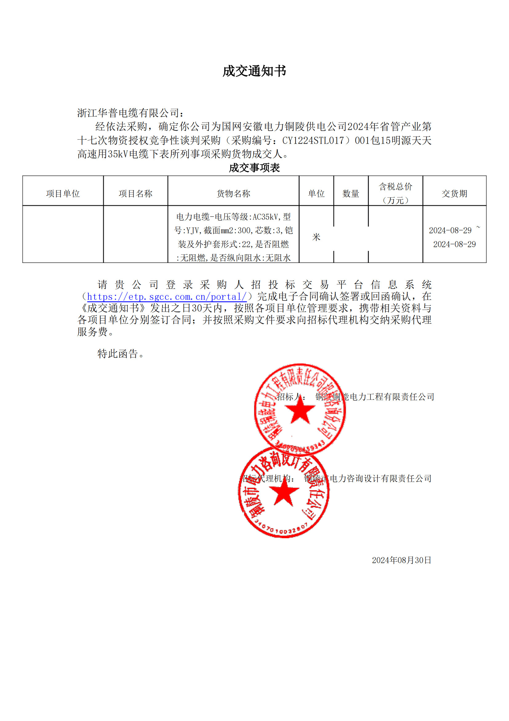 (إشعار الفوز بالعطاء) شركة إمدادات الطاقة الكهربائية الحكومية آنهوي تونغلينغ للمواصلات، الإدارة الإقليمية السابعة عشرة للصناعة، ترخيص المواد، التفاوض التنافسي، المشتريات في عام 2024