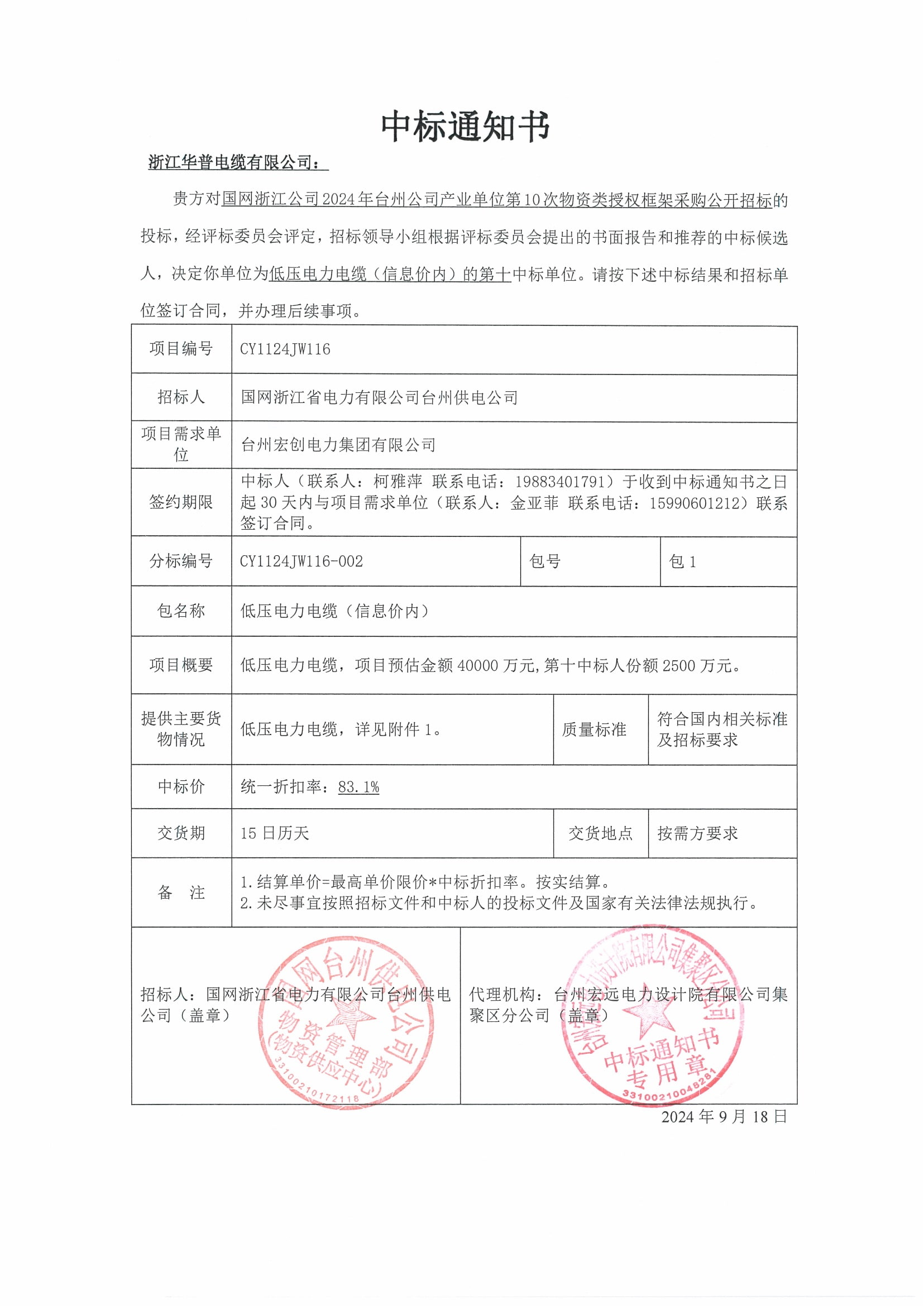 (إخطار بالجائزة) المناقصة العامة العاشرة لشركة State Grid Zhejiang لشراء إطار ترخيص المواد للوحدات الصناعية لشركة Taizhou في عام 2024
