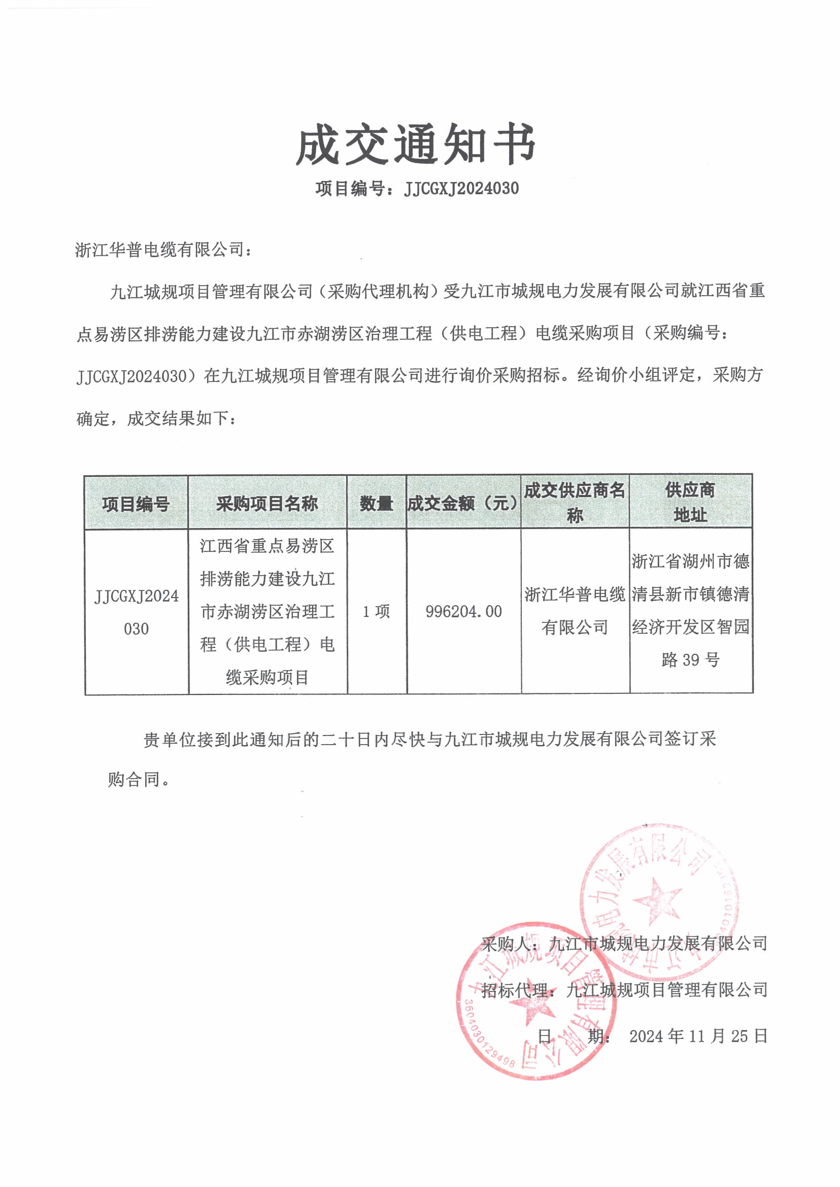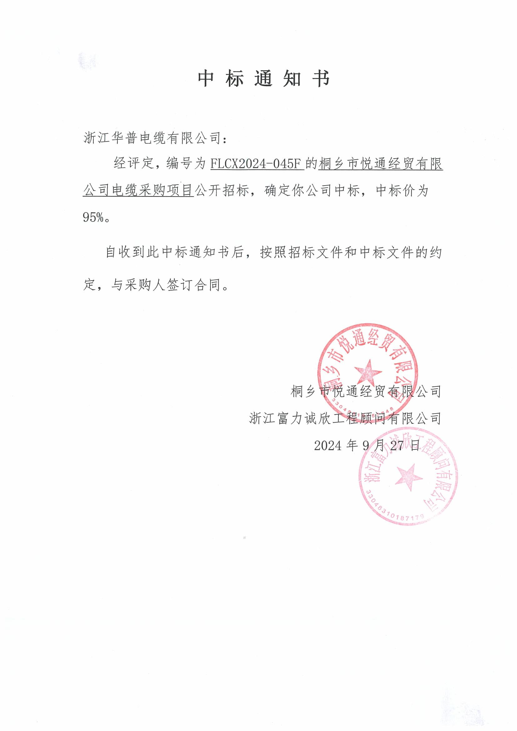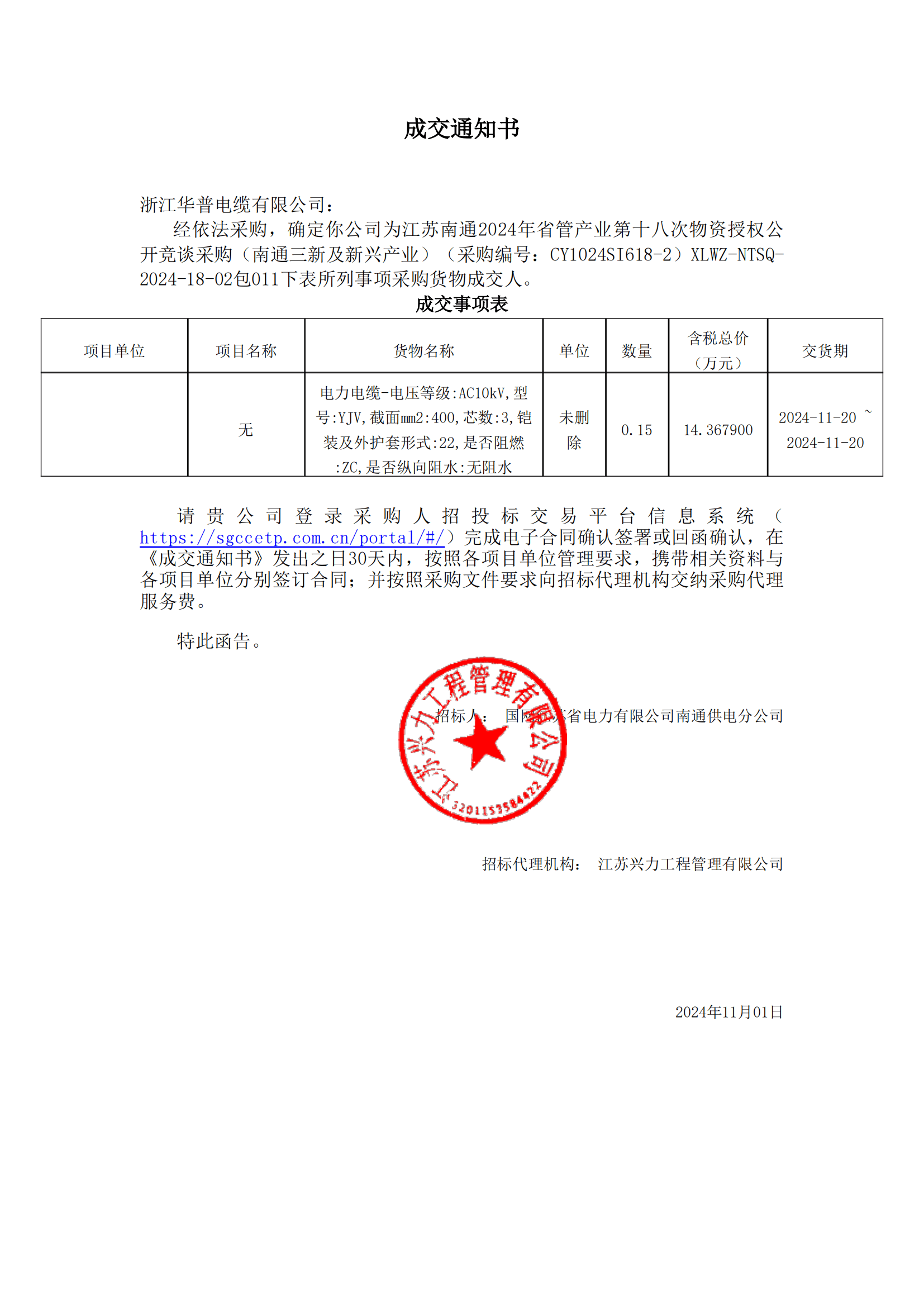(إشعار الفوز بالعطاء) شركة تونغشيانغ يويتونغ الاقتصادية والتجارية المحدودة. مشروع شراء الكابلات